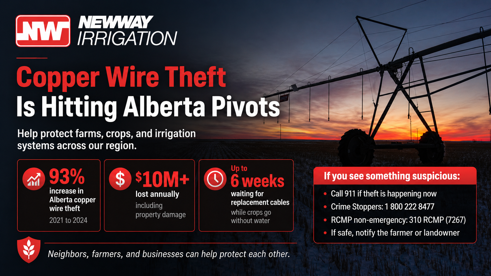 This is an active threat in Southern Alberta. Thieves have been cutting and stripping copper span wiring from irrigation pivots across the region. This is not a minor vandalism issue. It is targeted, costly, and happening in the dark. Here’s what every farmer needs to know.
